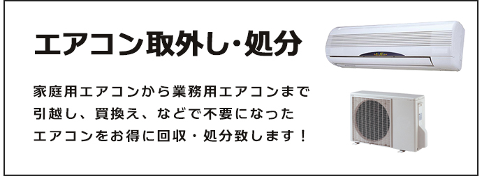 家庭用から業務用まで、引越しや買換えなどで不要となってしまったエアコンを格安で回収・処分いたします。 壁掛けエアコン・窓用エアコン・店舗やオフィス用のエアコンまで、どんなものでもおまかせください。高所作業や大量処分にも対応可能です。お電話一本ですぐに回収に伺います。