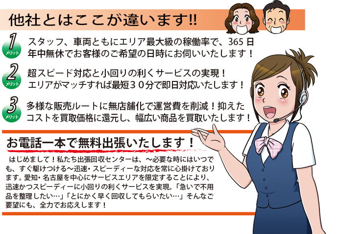 大阪府、兵庫県の不用品回収は出張回収センターにお任せください。その他お困りごとは「受付窓口」「アドバイザー」になんなりとご相談ください。